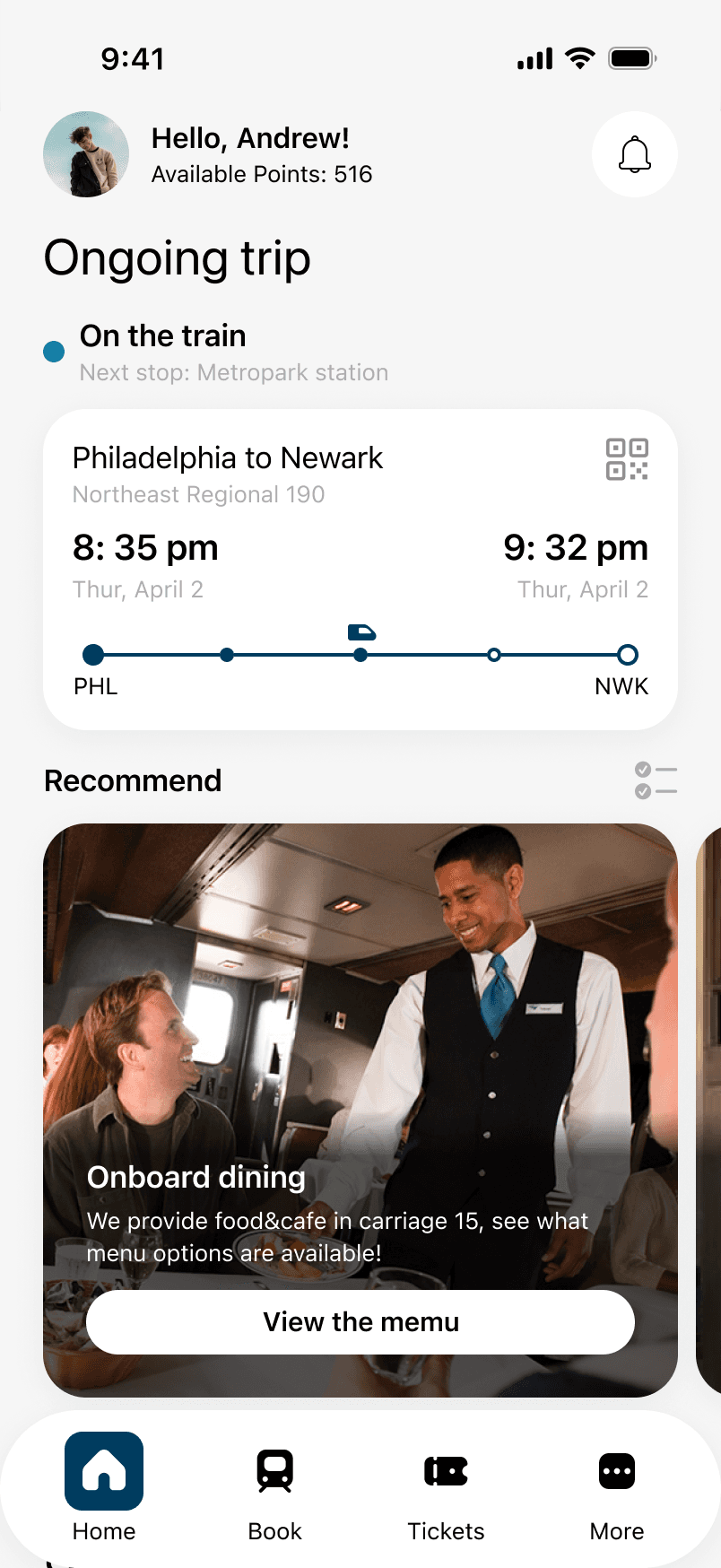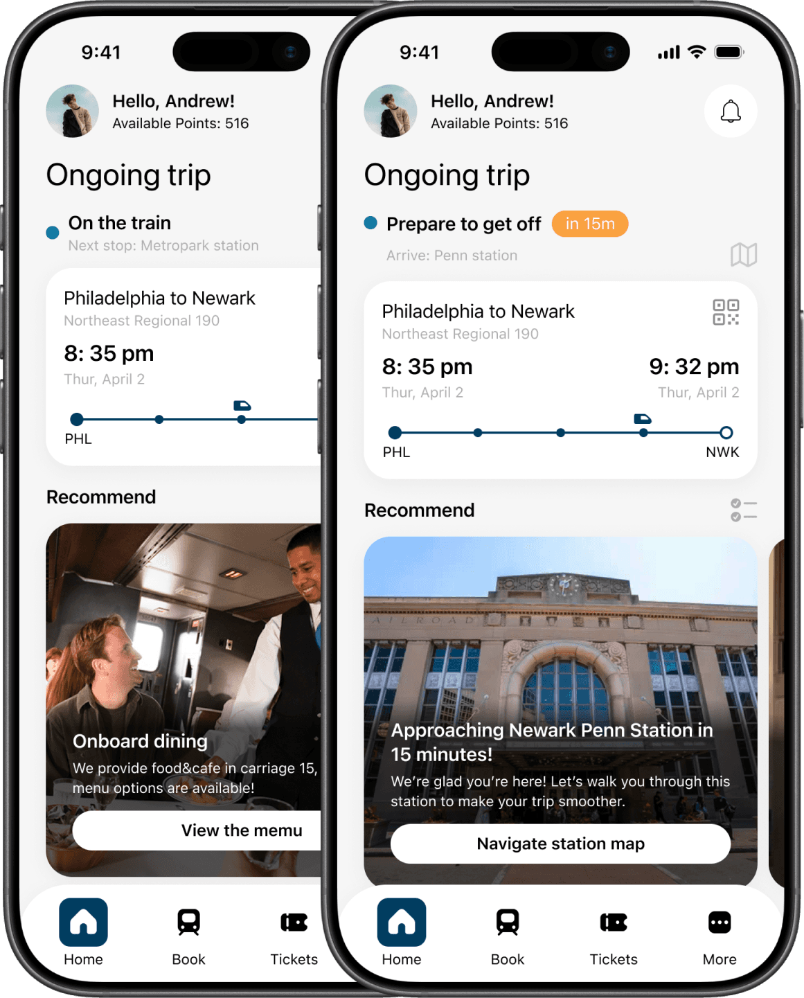 Live stop progress keeps you oriented onboard. As you approach your destination, a proactive alert walks you through the station ahead. Once you arrive, local services are surfaced, and the trip closes with a feedback prompt.
