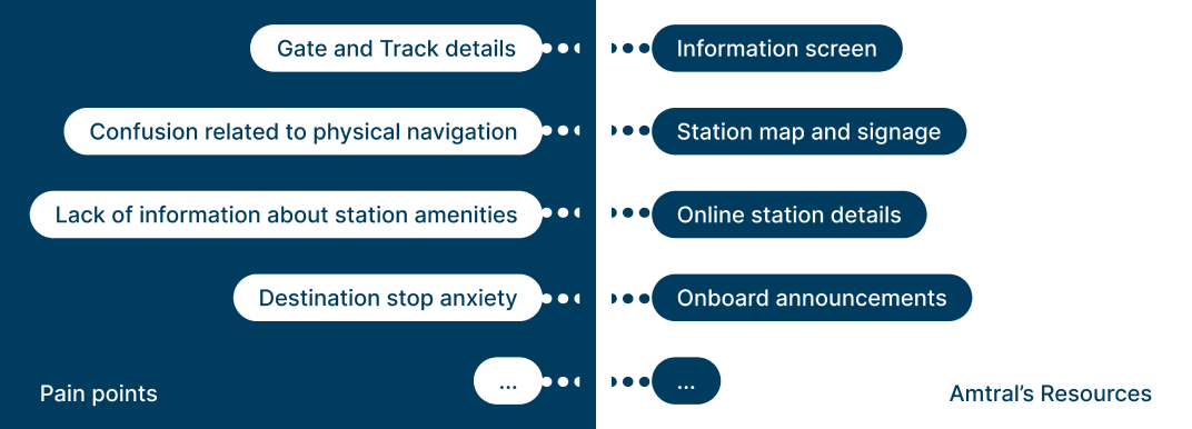 That response sent us back to the field. This time, instead of mapping pain points, we mapped Amtrak's existing resources against every user need we'd identified. What we found reframed everything.