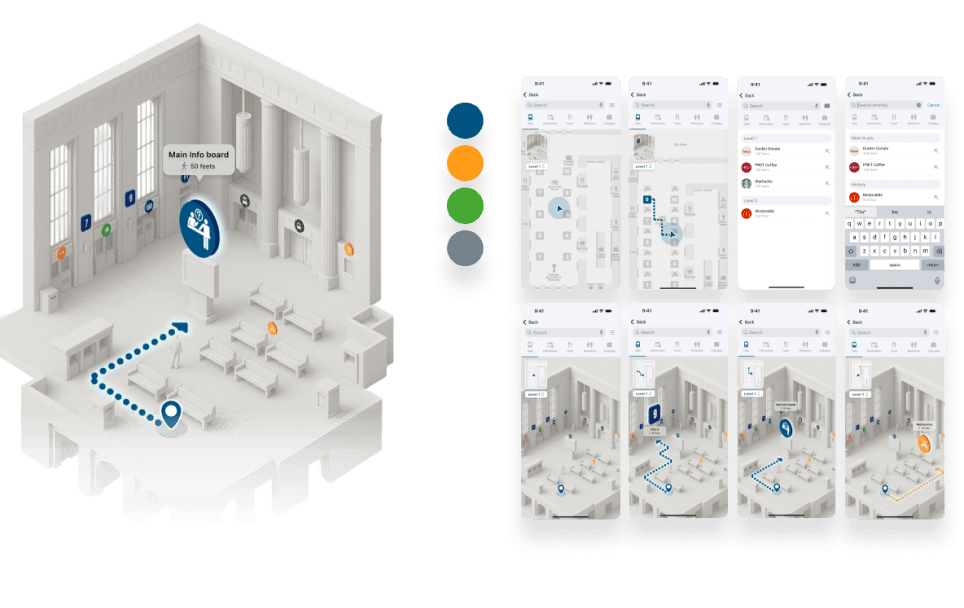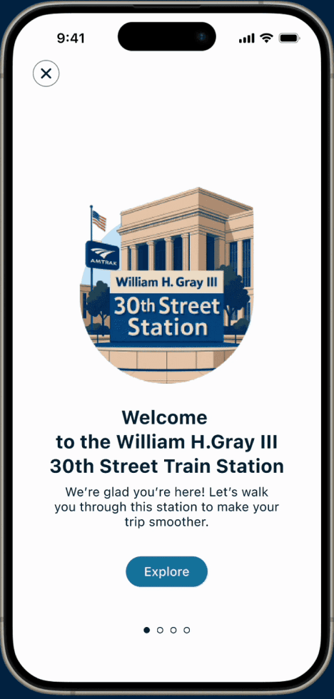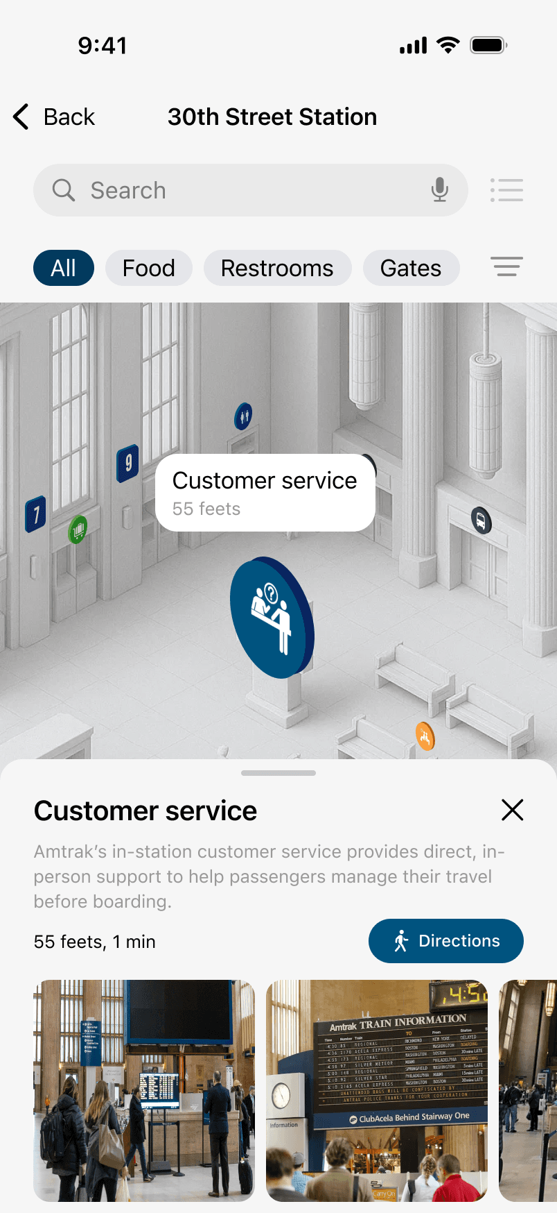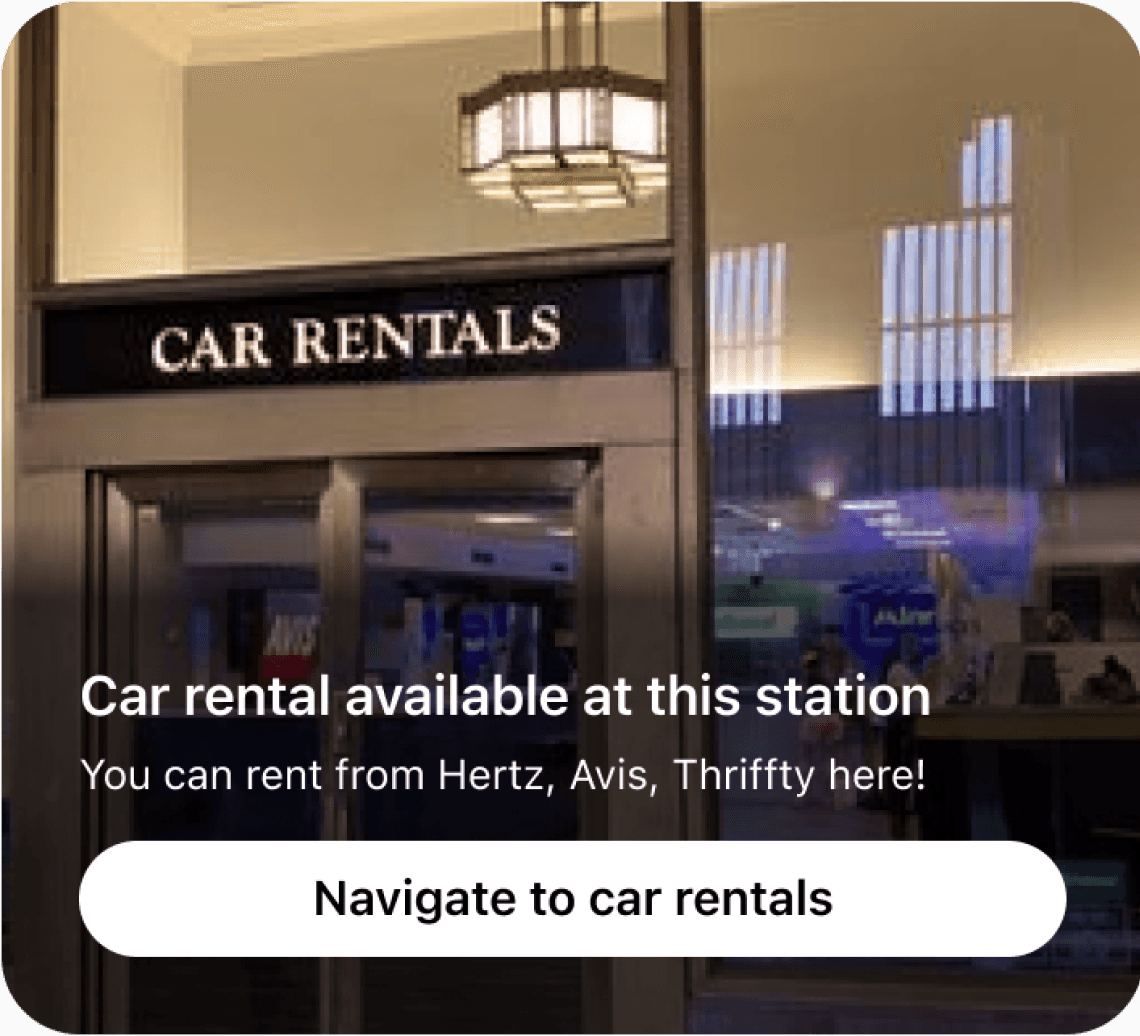 Stage-based prompts surface the right information at the right moment (e.g. station guide, food options, gate reminder). When you need more, the indoor map takes you there, step by step.