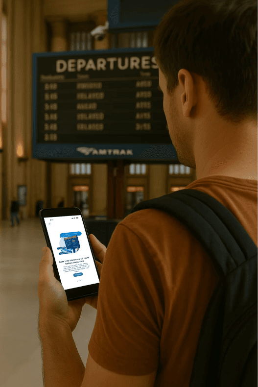 Contextual notifications proactively appear at key moments of the user journey, leveraging Amtrak’s location-based system.