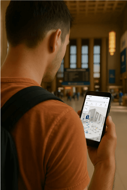 Travelers can easily navigate station amenities using the indoor navigation map. Consistent visual design between the digital map and physical signage system helps users quickly orient themselves and locate services.